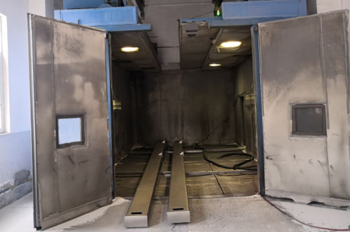 加工范圍:2套,每個移動噴漆室有2個工作位置,每個工位的尺寸為12000X7000mm,兩個噴漆室可連在一起工作,即24000X7000mm